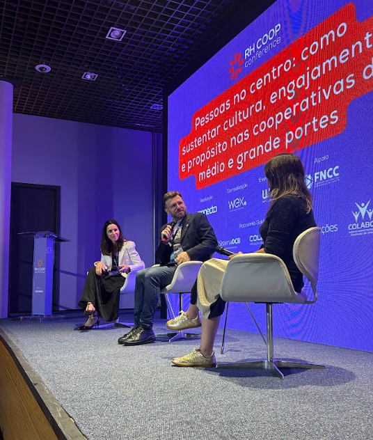 No palco RH Coop Conference, as atividades do segundo dia começaram com o painel “Pessoas no centro: como sustentar cultura, engajamento e propósito nas cooperativas de médio e grande portes”. O debate reuniu Mariana Porto, gerente de gestão de talentos humanos da Coopersystem; Diogo Anderson Angioleti, líder de Gente, Gestão e Inovação na Transpocred; e Raquel Campos, superintendente de Pessoas da Unimed BH.