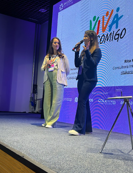 À tarde, a programação começou com palestra de duas colaboradoras da Cooperativa Comigo. Tani Melo Fernandes, gerente de RH, e Rita Karoline Rodrigues, consultora de RH, apresentaram o case “Programa de Cultura Viva Comigo: da estratégia à prática”. O time de RH da Comigo criou a iniciativa pensando no desenvolvimento e fortalecimento da cultura.